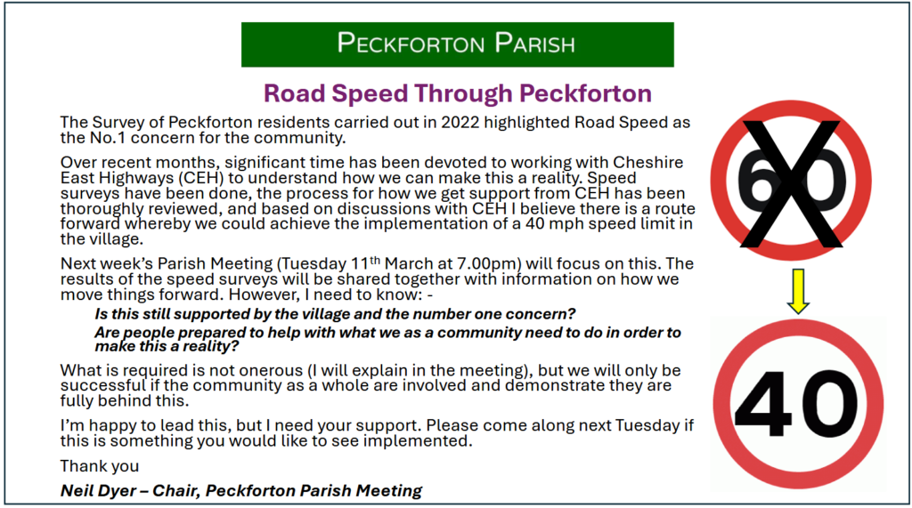 Increased collaboration between Peckforton and Beeston Parish meetings. | Make progress on the stalled speeding and highway safety report submitted to the local authority 12 months ago |